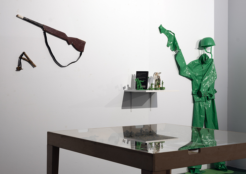 Wystawa Szymona Kobylarza Była sobie wojna to rozwinięcie podejmowanych przez artystę w jego wieloletniej praktyce tematów związanych z militaryzacją dzieciństwa, prowadzone zarówno w warstwie materialnej, jak i symbolicznej. Kobylarz koncentruje się na dziecięcych zabawkach militarnych jako nośnikach ideologii i emocji, które – choć ukryte za fasadą rozrywki – modelują społeczną wyobraźnię od najmłodszych lat.
