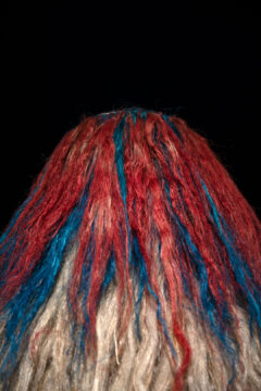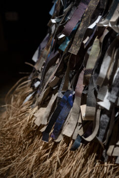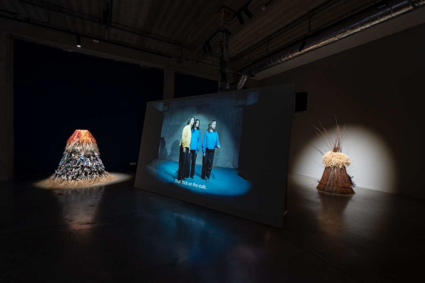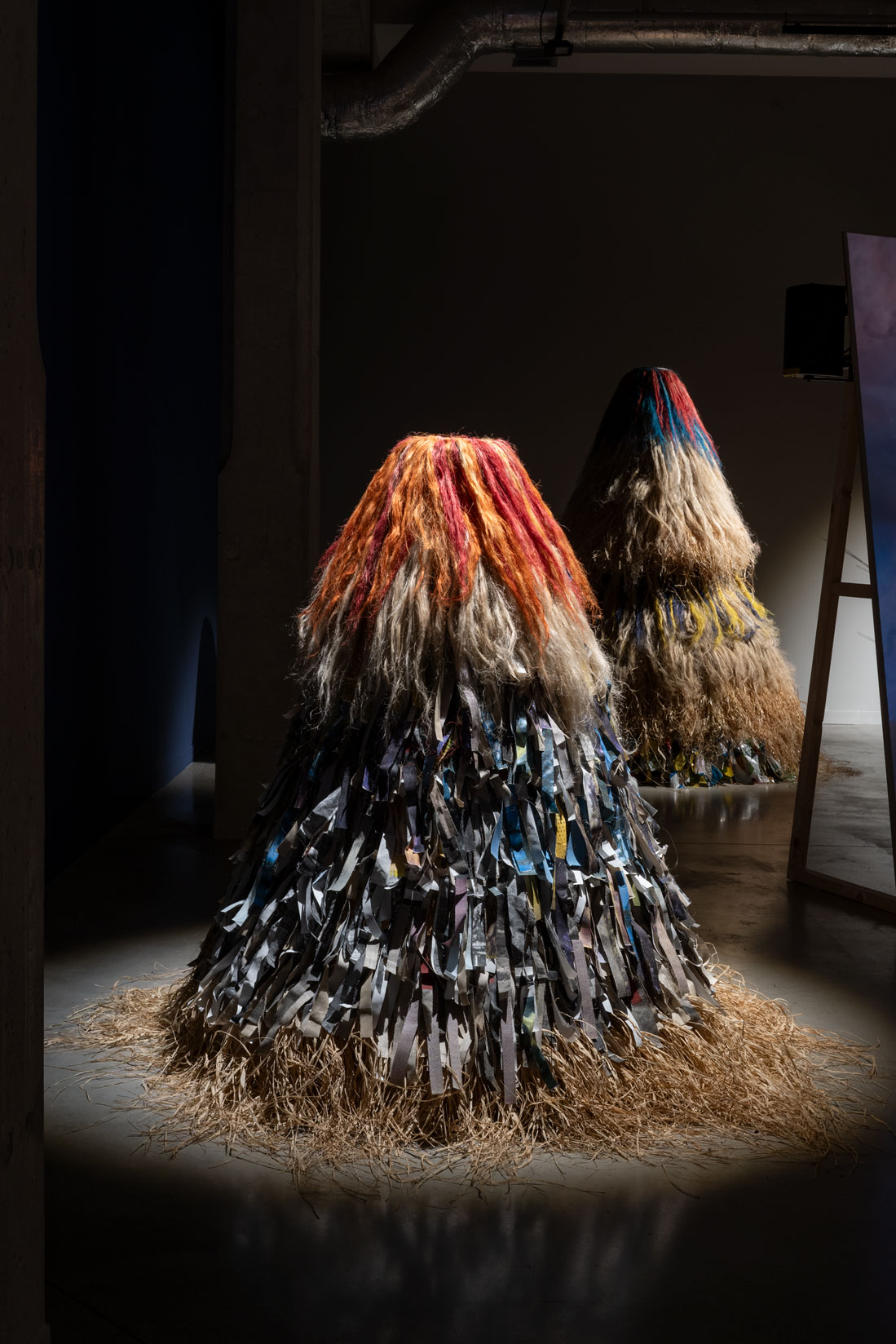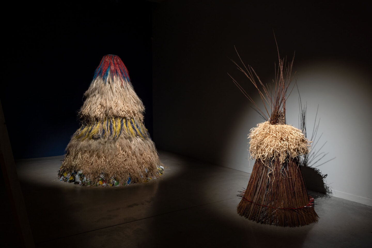 Wchodząc na wystawę wzrok zatrzymuje się na obiektach stworzonych z różnych niejednorodnych materiałów. Przypominają stogi siana, góry, chochoły czy stroje tancerzy Kumpo. Kumpo to tradycyjna postać z kultury ludu Diola w Senegalu i Gambii – ubrana w trawy i liście, tańczy podczas festiwali i uosabia ducha lasu lub społeczności. Tancerz pozostaje niewidoczny, scala się ze swoim kostiumem. W polskiej tradycji podobny kształt przybiera chochoł, który okrywa żywą roślinę w zimowym czasie jej wegetacji. W materialnej formie chochoły stanowią zagadkę, tego co kryje się w ich środku. Kumpo to także duch opiekuńczy, który jest jednością i wspiera wspólnotę. Na wystawie obiekty mają charakter hybrydycznych konstrukcji, poskładane z różnych materiałów są emanacją duchów współczesnej nadziei. Lokują się pomiędzy działaniem ludzkiej ręki a autonomią materii. Mediują między dawną użytkową funkcją a symbolicznymi znaczeniami, uruchamiającymi się w nowych kontekstach. Pracują jak ślady minionych praktyk i możliwych przyszłości.