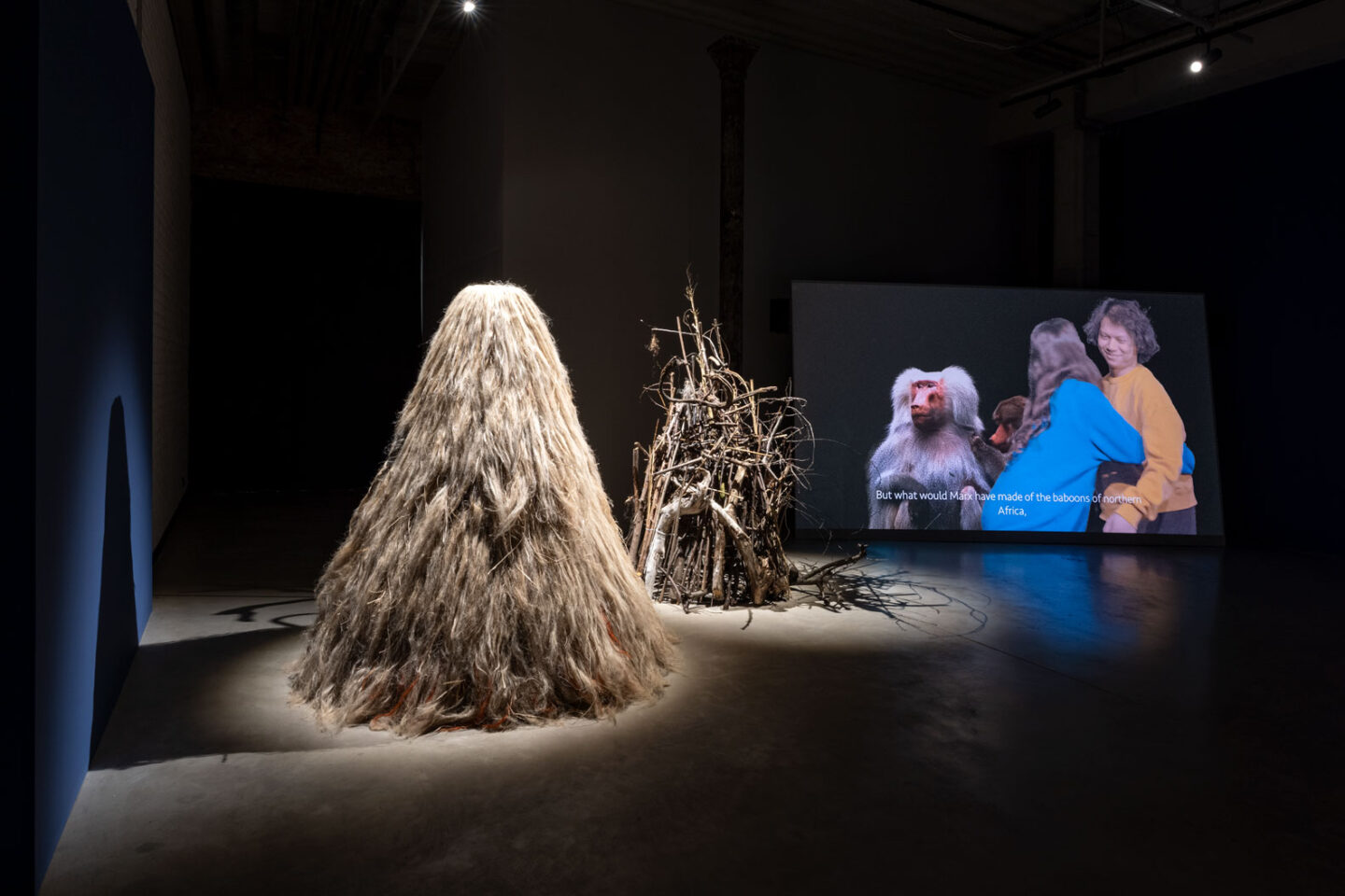 Artystka układa fragmenty świata z kapitalistycznych ruin – ekologicznych, społecznych, językowych – pokazując, że choć system wydaje się monolityczny, w rzeczywistości jest połatany, pełen pęknięć, nieciągłości i miejsc oporu. Dokładnie jak w jej pracy wideo, w czytanej przez narratorkę, Bożenę Grzyb-Jarodzką, opowieści o pawianach pochodzącej z książki Jasona Hribala Fear Of The Animal Planet: The Hidden History of Animal Resistance. Ludzie uważają je za śmieszne i błazeńskie, ale ich wierność i miłość do potomstwa daje im siłę, żeby biec za pociągiem, w którym jedzie skradzione przez człowieka dziecko. Próbują napadać na pociągi, żeby odzyskać swoje potomstwo.