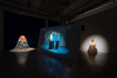 Istotny element wystawy – dwukanałowe wideo O czym nie możemy pomyśleć? – to rodzaj eksperymentalnego teatru telewizji. W kampowym stylu rodem z lat 90., artystka miesza rzeczy, słowa i znaczenia. Reinterpretowane teksty kultury, muzyka Arnolda de Boer, powracające motywy i frazy działają jak mantry czy rytuały. Wywołują efekt nawarstwiających się kręgów i powolnych przemian. Słowa – wypowiadane, powtarzane, kołysane – stają się materią o własnej sprawczości.