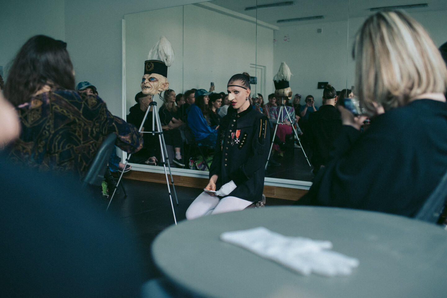 Stępień to performerka i malarka, która w mijającym roku była szczególnie widoczna na stołecznej scenie, wcielając się w ambasadorkę queerowej śląskości. W czerwcu w Komunie Warszawa artystka zaprezentowała performans Wnuczka górnika, podczas którego wcieliła się w postać Skarbnika, demona i władcy górniczych podziemi. Usadowiona przy stolikach publiczność mogła przyglądać się szeregowi działań performerki – wydawać by się mogło, że ryzykownych, ale także fajnych wizualnie, jak skradanie się Skarbnika za czarną kotarą czy wydeptywanie jego czarcich kopytek na podłodze przyprószonej mąką. Performans zakończył się lekko i wspaniale wyskokiem górniczego demonka przez okno, który tanecznym krokiem zeskakiwał z daszków budynku i zniknął za węgłem. Wrócił w październiku podczas wystawy Córka górnika, gdzie odegrał podwójną rolę: kuratorki i operatorki windy wiozącej gości na wystawę.