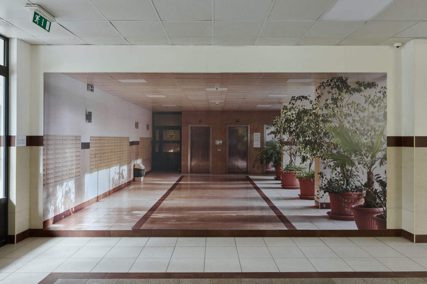 Home Staging to praktyka dekoratorów mieszkalnych wnętrz inwestycyjnych: lokal przeznaczony na sprzedaż lub wynajem ma robić dobre pierwsze wrażenie, aby jego wartość rynkowa się zwiększyła. Powierzchowne zabiegi wykończeniowe i dekoracyjne stanowią rodzaj scenografii: panele podłogowe, tanie, ale efektowne meble, obrazki ścienne z uniwersalną treścią. Choć rynkowe siły próbują przejąć blok od środka, jego codzienna sceneria pozostaje bardzo prawdziwa.