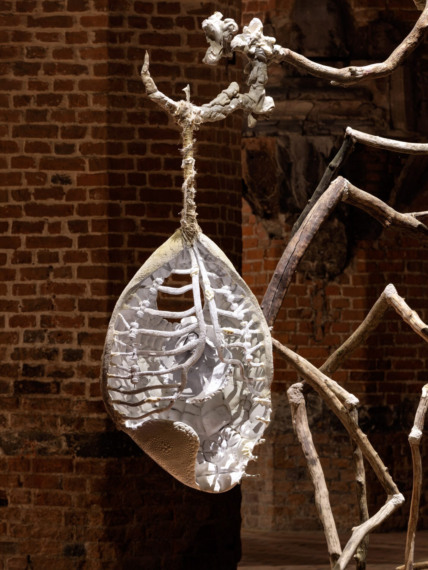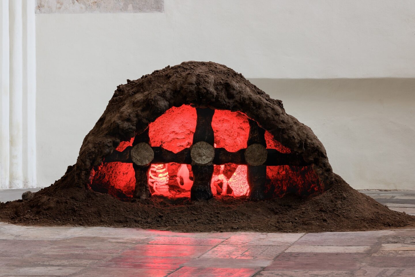 Instalacja site specific, zlokalizowana w nawie głównej Galerii EL, stworzona została przez artystę w oparciu o architekturę miejsca. Główną inspiracją dla pracy była konstrukcja odkryta w Mezirechu na Ukrainie – zbudowana około 16 tysięcy lat temu z kości mamutów. Czaszki i żuchwy tych zwierząt tworzyły krąg, wewnątrz którego rozpalano ogień. To tam odbywało się życie pierwszych wspólnot – ich codzienność, rytuały i przetrwanie. Ślady podobnych konstrukcji odnaleziono w Krakowie, nad Dnieprem, w Rosji. Wszystkie miejsca prawdopodobnie łączyło to samo dążenie – do przekształcenia surowej natury w przestrzeń bezpieczną do zamieszkania.