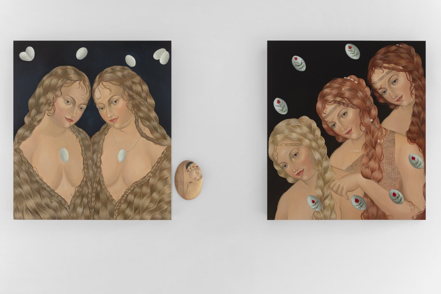 Kobiece włosy, nawet schowane pod czepkiem, upięte ciasno, stanowią wyraźne ostrzeżenie. Wydobywają się na wolność, niemal niezauważalnie, cienkimi, niesfornymi kosmykami, co przywodzi na myśl opowieści o kobiecym sprycie – to dzięki niemu panny i mężatki prześlizgiwały się pomiędzy zakazami i nakazami kolejnych epok, także epok w historii sztuki – bez kobiet, nie dla kobiet, choć z kobietami w roli martwych natur. Ewa Czwartos w nowych pracach przywołuje postać Wenus ze słynnego obrazu Lucasa Cranacha, który ukazał ją wraz z Kupidynem trzymającym plaster miodu i żądlonym przez pszczoły – była to wyraźna przestroga przed zmysłową rozkoszą, która nieuchronnie niesie ze sobą cierpienie. Malarka pozbywa się jednak Kupidyna, zamiast tego zwielokrotniając obecność Wenus. Znikają pszczoły, czyli kara za grzechy, a pojawia się motyl: wolność, przemiana, odrodzenie. Multiplikacja kobiecej postaci, co samo w sobie stanowi alegorię siły, jest charakterystyczna także dla prac Karoliny Żądło, która dodatkowo podkreśla ich indywidualność, zwracając uwagę na różnorodność kobiecego doświadczenia.