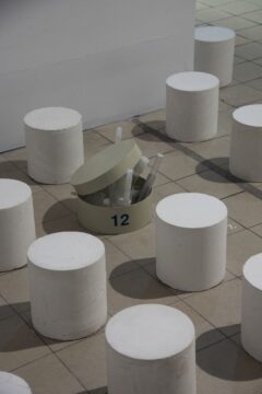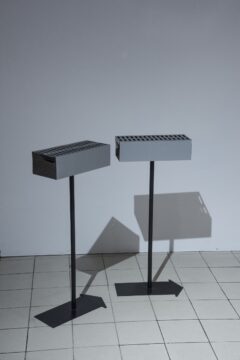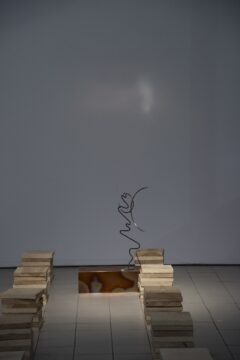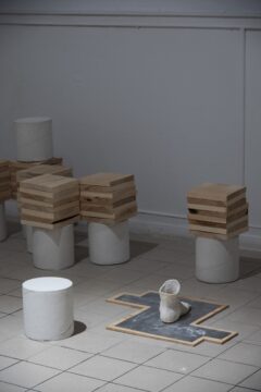 Wystawa wypełnia wnętrze galerii, ale także je przeobraża. Przestrzeń zostaje zrytmizowana przez układ drewnianych modułów i cylindrycznych ekspozytorów. Pracownia Wschodnia staje się planszą, sceną, polem działania.