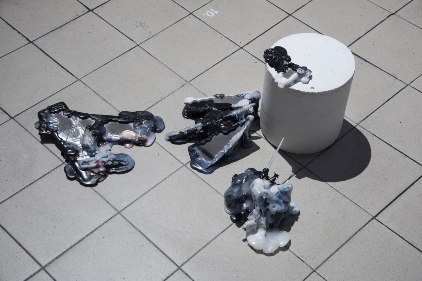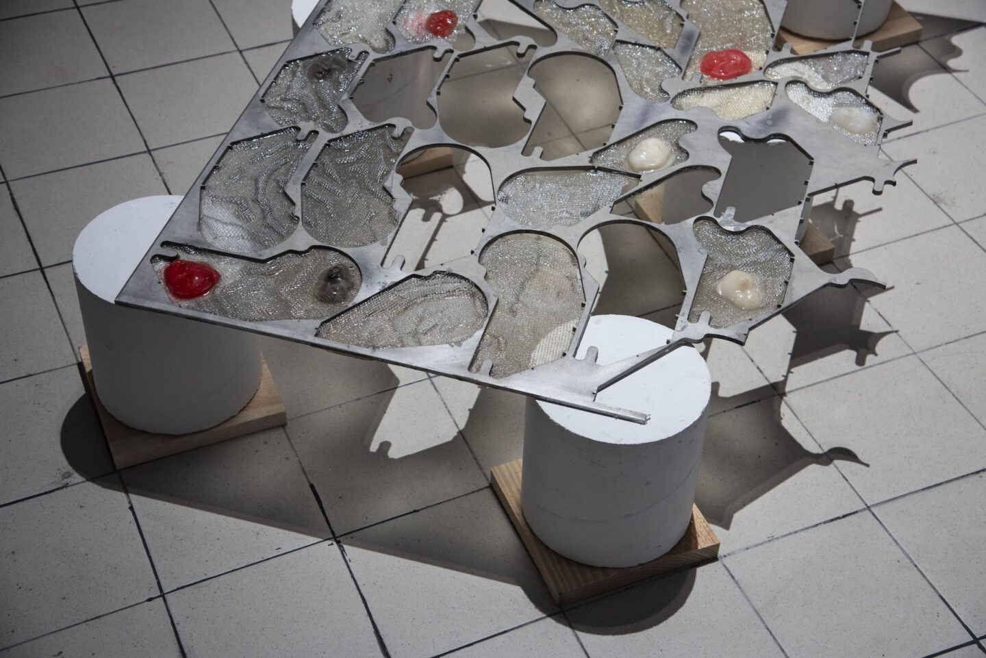 A pod nią pulsuje podskórna sieć przewodów, rur i kabli, niczym układ nerwowy, podtrzymuje trwanie tego, co widoczne na powierzchni. Tam też znajdują się warstwy instalacji, zamknięte przestrzenie, do których nie mamy dostępu. Podłoga staje się granicą między tym, co widzialne, a tym, co skryte. Między tym, co zmysłowe, a tym, co materialne. Między ciałem a ziemią. Między tym, co trwa a tym, co zostało utracone. Co osuwa się w dół, co upada, co wraca. To, co jawne, opiera się na tym, co ukryte.