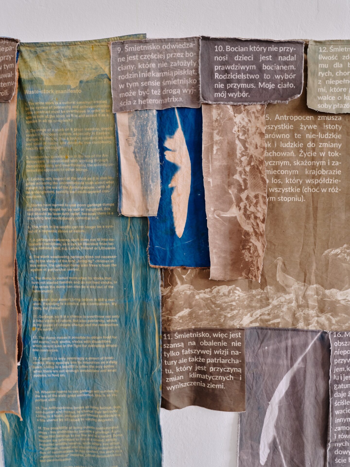 Diana Lelonek, „Manifest śmieciowego bociana”, 2022–2026, cyjanotypia na bawełnie i lnie tonowana pigmentami i barwnikami naturalnymi, fot. Bartosz Górka