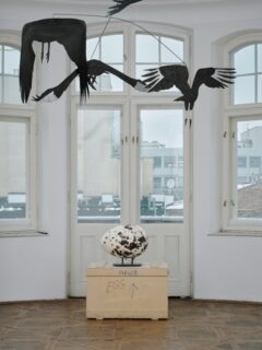 Magdalena Santos, „Sępy”, 2026, stal, aluminium, smoła dachowa, popiół, nylon; Joanna Rajkowska, „Pisklę. Rybitwa czubata”, 2024, gips akrylowy, farba akrylowa, wosk pszczeli, nagłośnienie, fot. Bartosz Górka
