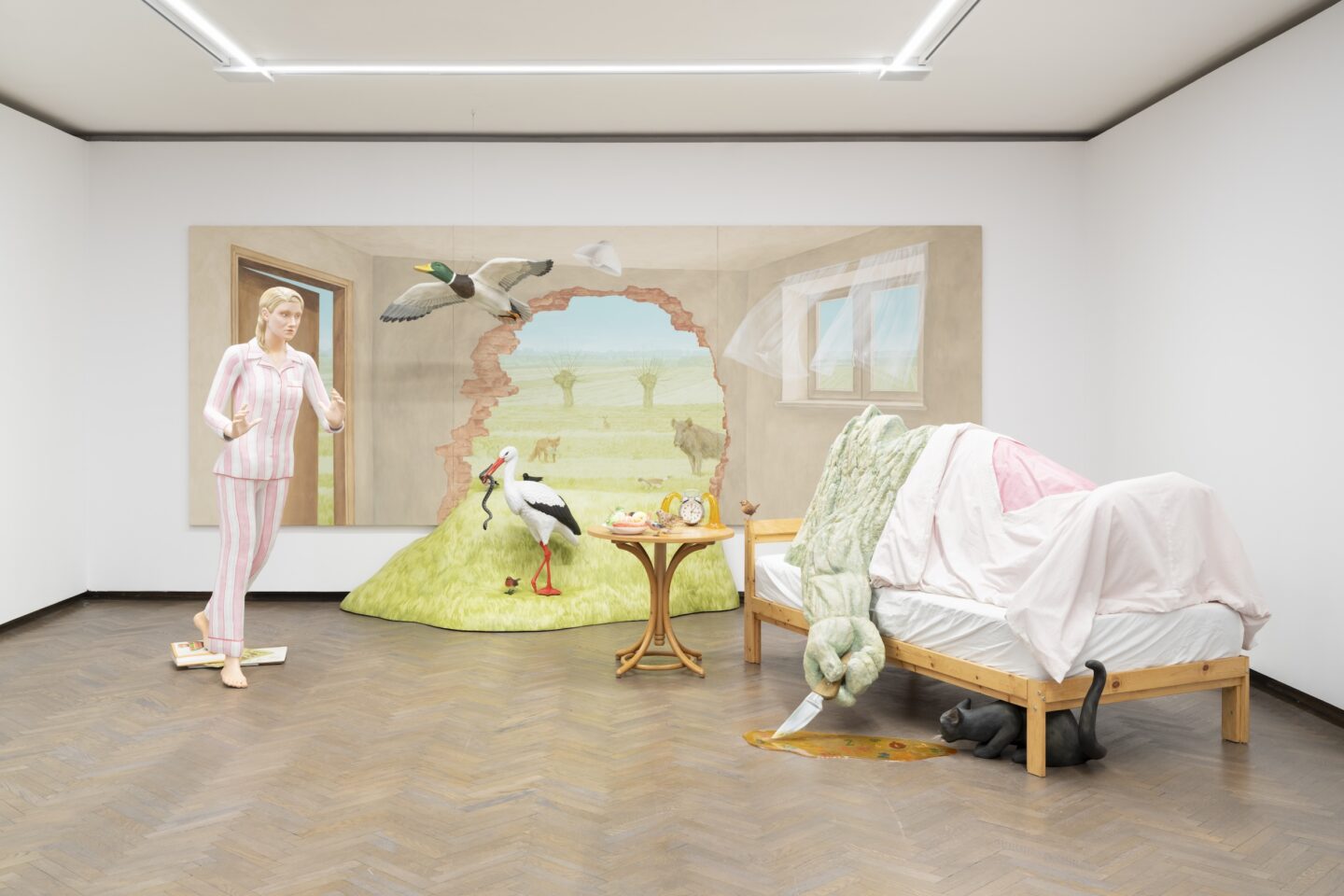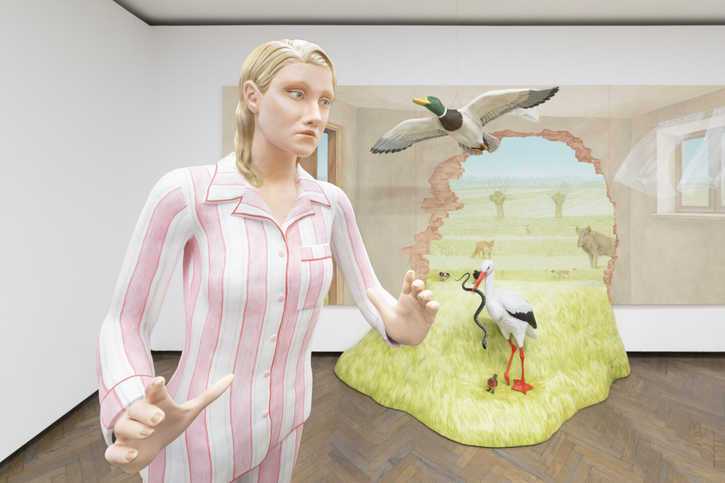 Sięgając po medium dioramy, artystka odwołuje się zarówno do XIX-wiecznej tradycji muzealnych aranżacji przyrodniczych, prezentujących wypchane zwierzęta na tle malowanych krajobrazów ich naturalnych siedlisk – jak i do historii wystaw narodowych XX wieku. Te ostatnie służyły budowaniu ikonicznych obrazów nowoczesnych narodów, często poprzez rozbudowane ruchome scenografie, a niekiedy nawet inscenizacje z udziałem statystów pasących owce. Pejzaże europejskich krajów były jednak dość podobne. Własny ikoniczny krajobraz należało więc wybierać na zasadzie dyferencjacji. Polski miał wiązać się z wiejską sielanką, brzozami, lipami, wierzbami i ptakami. Opierające się na narodowych narracjach historyczne dioramy operowały opowieściami sytuującymi się na przecięciu jednostkowego doświadczenia i wielkich procesów geopolitycznych. Pakosz wykorzystuje te strategie w sposób subwersywny. Jej opowieść osadzona w nawiedzonym domowym wnętrzu – osobista, pełna napięcia i podszyta mrocznym humorem – zarazem podważa i problematyzuje tradycyjne narracje narodowe.