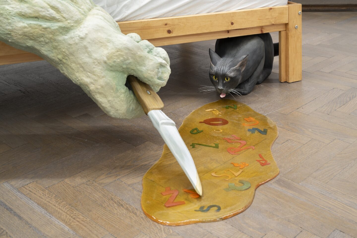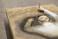 Twórczość Pakosz podejmuje refleksję nad ideą tożsamości narodowej – kategorią, która ze względu na śląskie pochodzenie artystki nigdy nie była dla niej oczywista ani naturalna, a jednak pozostaje częścią jej własnej tożsamości. Jej twórczość jest usytuowana w osobistym doświadczeniu, które może być źródłem inspiracji, ale i ograniczeniem. Mniejsza z prezentowanych na wystawie dioram przedstawia mężczyznę z głową zanurzoną w głębokiej, błotnistej kałuży. Nieszczęśnik bazgrze patykiem w błocie wiejski pejzaż, próbując zobrazować to, co dostrzega pod wodą. Tymczasem włosy na jego głowie układają się w miniaturowe wzgórza i sosnowy krajobraz, wysyłając odmienny komunikat. Artystka nie ufa własnym przekonaniom. Wie, że nie sposób obiektywnie ocenić rzeczywistość, w której jest się zanurzonym.