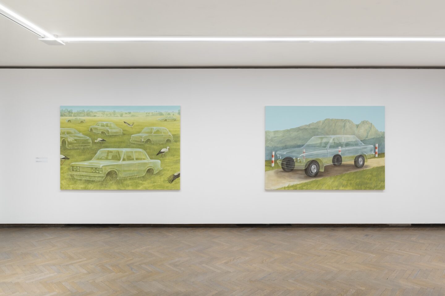 W malarstwie Pakosz elementy krajobrazu, bursztyny i ptaki znane z historii polskiej sztuki łączą się także z codziennymi, a czasem przypadkowymi symbolami polskości. Biało-czerwone słupki drogowe korespondują z barwami licznie reprezentowanych na wystawie bocianów. Na jednym z największych obrazów ptaki te przechadzają się pomiędzy wrakami samochodów polskiej produkcji – warszawy, małego i dużego fiata, powstałego w PRL prototypu FSO 1100 Coupe; a także pojazdów mających status kultowych – prezydenckiego bmw czy spopularyzowanego w latach 90. za sprawą filmu Kiler nissana. Samochód, artefakt XX wieku, symbol narodowej myśli technicznej, staje się nie tylko emblematem banalnego nacjonalizmu, ale także przedłużeniem tożsamości prowadzącej go osoby. Ten wątek rozwija niewielki autoportret artystki, inspirowany słynnym obrazem Tamary Łempickiej. Pakosz ukazuje siebie w oknie samochodu, lecz jej wizerunek różni się od pełnych erotyzmu przedstawień eleganckich kobiet z magazynów mody dwudziestolecia międzywojennego. Jej pozbawiona makijażu twarz kontrastuje z wyrafinowaną stylizacją, podobnie jak zwykły pojazd z malarskiego cytatu nie ma prestiżu zielonego bugatti – symbolu wyzwolonej nowoczesnej kobiety w sztuce Łempickiej.