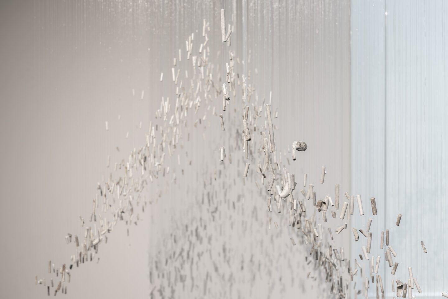 Podobnie jak ptaki, które stanowią ważny motyw w całej jej twórczości, Jessica Ostrowicz równie niezmordowanie zbiera fragmenty swojego otoczenia. W aktach tak naturalnych jak gest dziecka spontanicznie podnoszącego z ziemi jakiś kamyk, artystka gromadzi przedmioty, wydające się na pierwszy rzut oka bezwartościowe albo zepsute. Z tych wciąż powiększających się organicznie archiwów czerpie wiele jej kolejnych prac. Instalacja Archive of Exhales składa się z tysięcy glinianych fajek i ich fragmentów, uzbieranych przez lata nad Tamizą. W uzupełniającej ją instalacji dźwiękowej artystka dopełnia cykl oddychania człowieka, którego ostatnim kontaktem z fajką jest wciągnięcie dymu a następnie wypuszczenie go poprzez akt wydechu przez każdą pojedynczą fajkę.