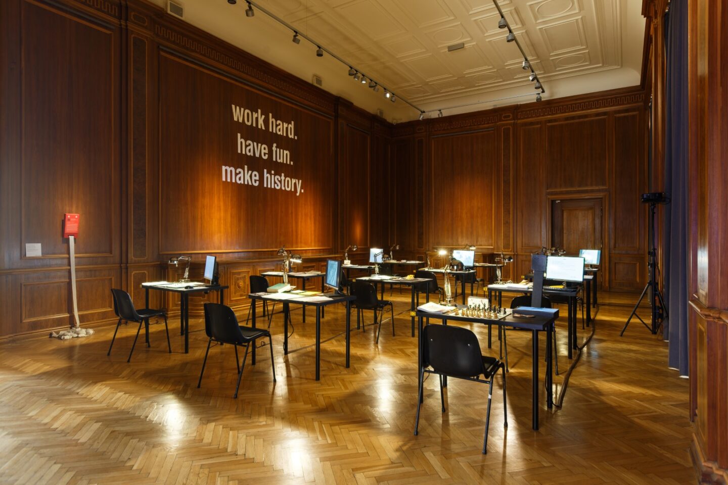 Wśród wielu interesujących prac, które można znaleźć w drugiej części ekspozycji, moją uwagę przykuł szczególnie projekt Ludzkie komputery kolektywu RYBN.ORG. Gdyby z jakiegoś powodu trzeba było ograniczyć budżet AI – algorytmów iluzji, wystarczyłoby chyba pokazanie tylko tej pracy. Świetnie wpisuje się ona w wystawę, przede wszystkim współgrając z jej spokojnym, powolnym rytmem i żartobliwymi wtrąceniami. Ale proponuje też obraz sztucznej inteligencji, w którym splata się ona z szeregiem różnych praktyk dalekich – jak mogłoby się często wydawać – od historii samej technologii i nauki. Podobnie jak cała wystawa, nie proponuje też nachalnych, jednoznacznych odpowiedzi i skupia się raczej na stawianiu pytań. Nie bez znaczenia pozostaje tu również wątek szachów. Ludzkie komputery to kilkanaście stanowisk, na których znajdujemy wydruki, książki, czasem urządzenia (np. metronom) lub podłączone do komputerów monitory, co pozwala nam korzystać z sugerowanych treści online. W ten sposób poznajemy kluczowe fakty dotyczące historii technologii i jej powiązań z życiem społecznym – a przynajmniej tego, jak ta historia przedstawia się w propozycji RYBN.ORG. Możemy zapoznać się z tym wszystkim (w tym też zadaniami do zrealizowania), przechodząc dowolnie od stołu do stołu. Z tym, że znacznie lepiej jest założyć słuchawki z audio-przewodnikiem, który wskazuje kolejność oglądania materiałów. Twórcy postanowili kierować nas po sali ruchem skocza szachowego – dwa stoły do przodu lub do tyłu, a potem w lewo lub w prawo. To żarcik, który nawiązuje do wspomnianego wcześniej Mechanicznego Turka, ale też metafora. Projekt wychodzi od przypomnienia, że słowo „komputer” początkowo oznaczało człowieka, który zawodowo dokonywał obliczeń. Z biegiem lat to zadanie zostało przeniesione na maszyny, technologia się rozwinęła. Ale pojawiło się pytanie, jak bardzo w tym czasie sami staliśmy się „komputerami”, czyli jak głęboko różne algorytmy wpływają dzisiaj na nasze zachowania.