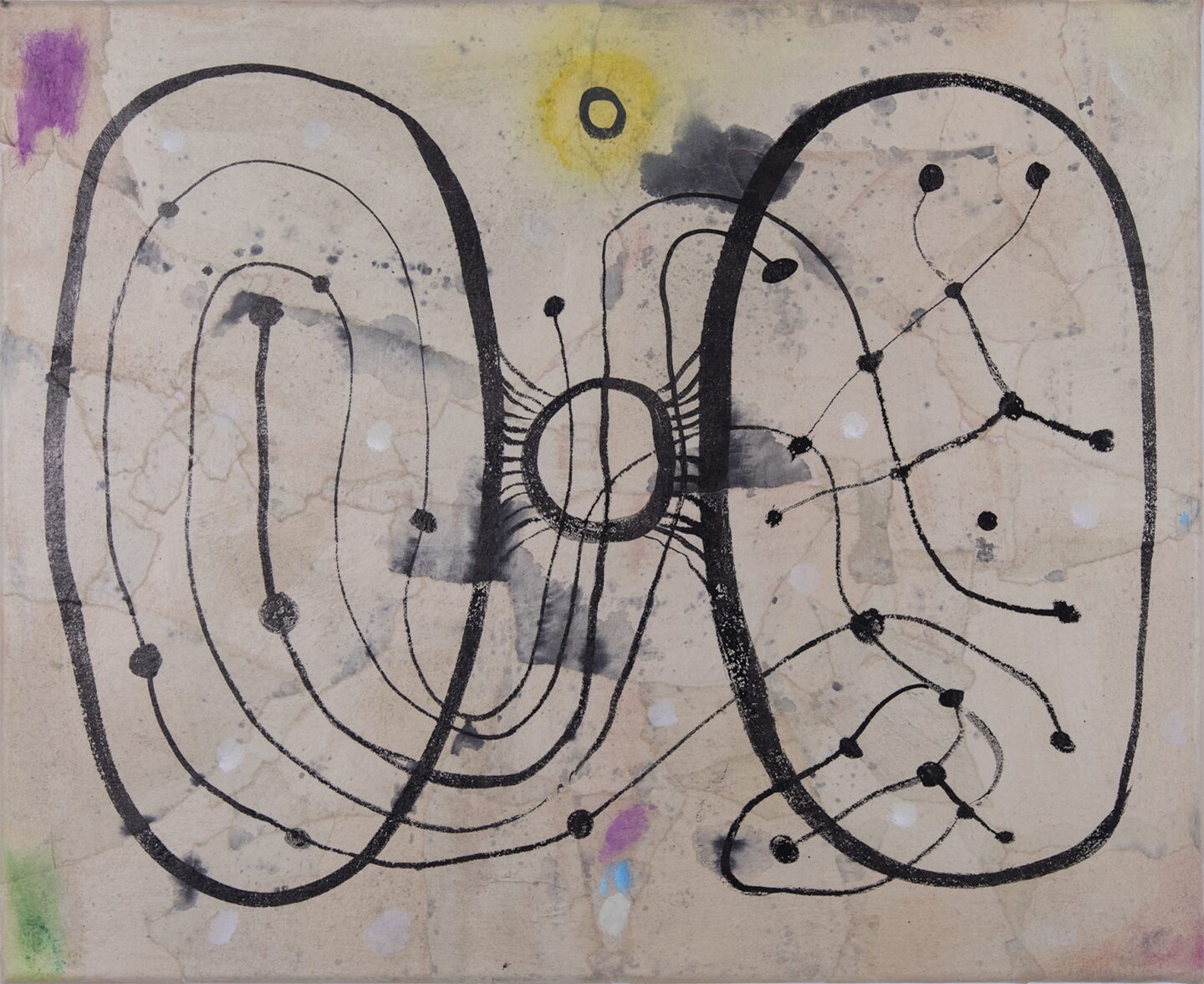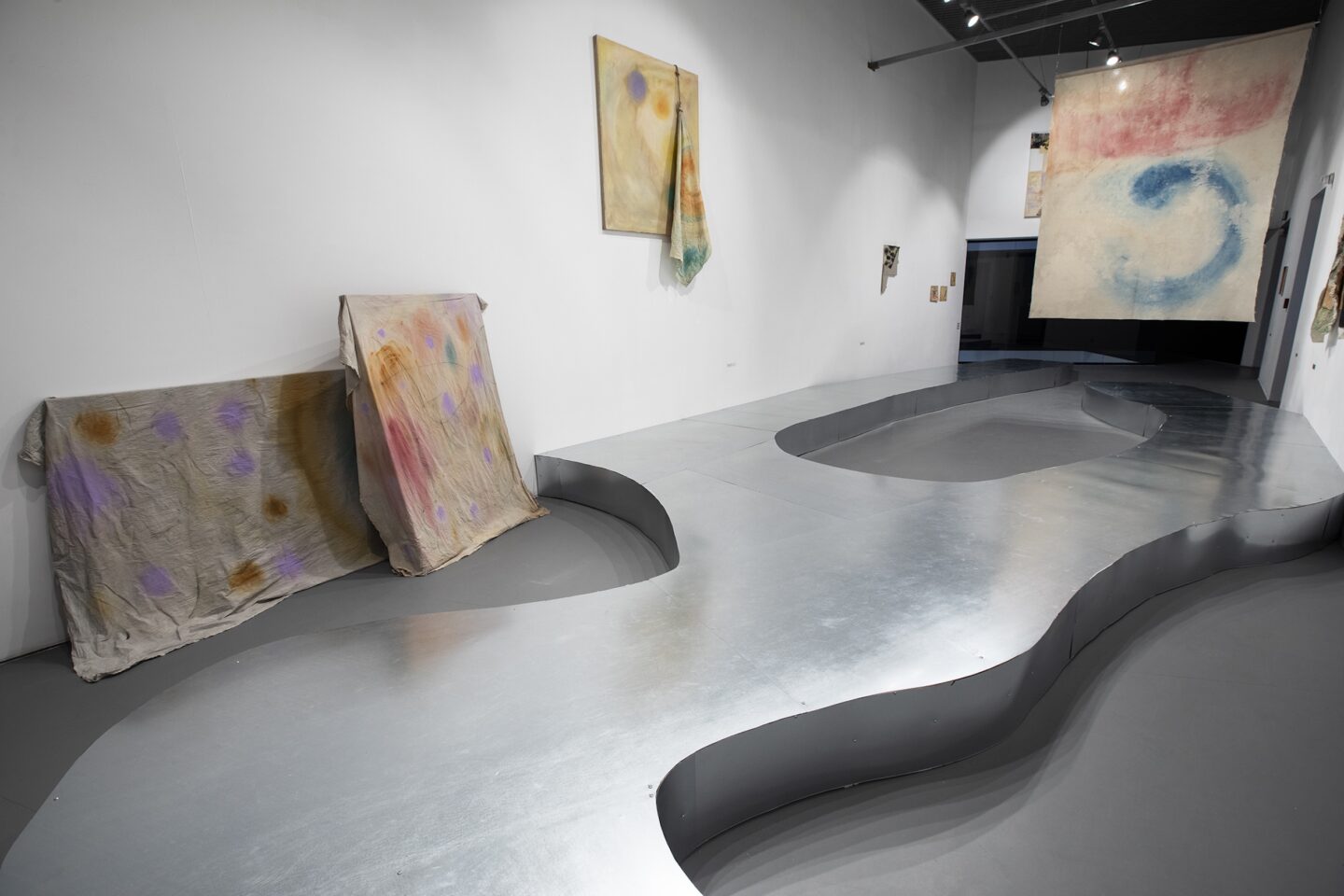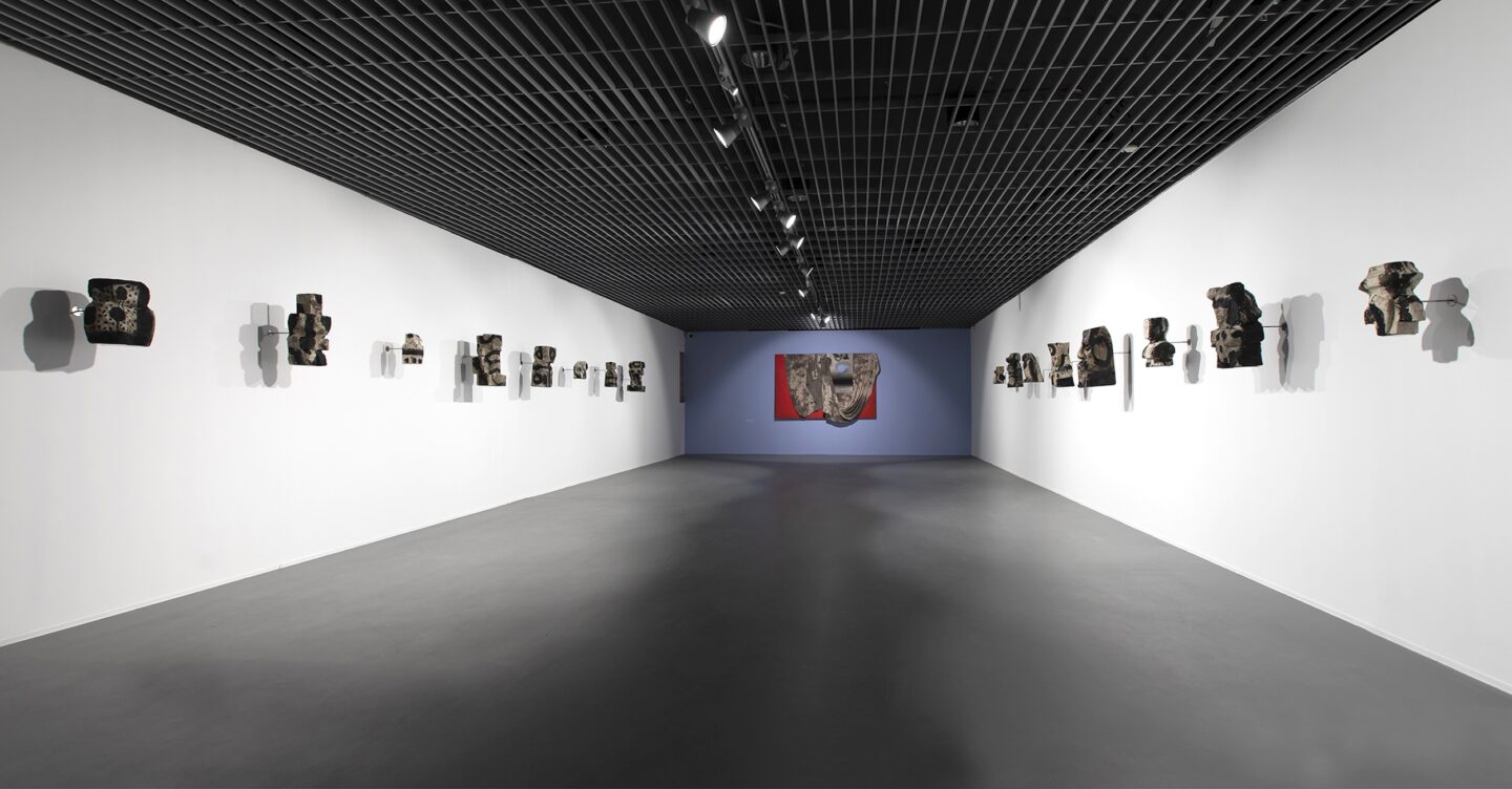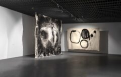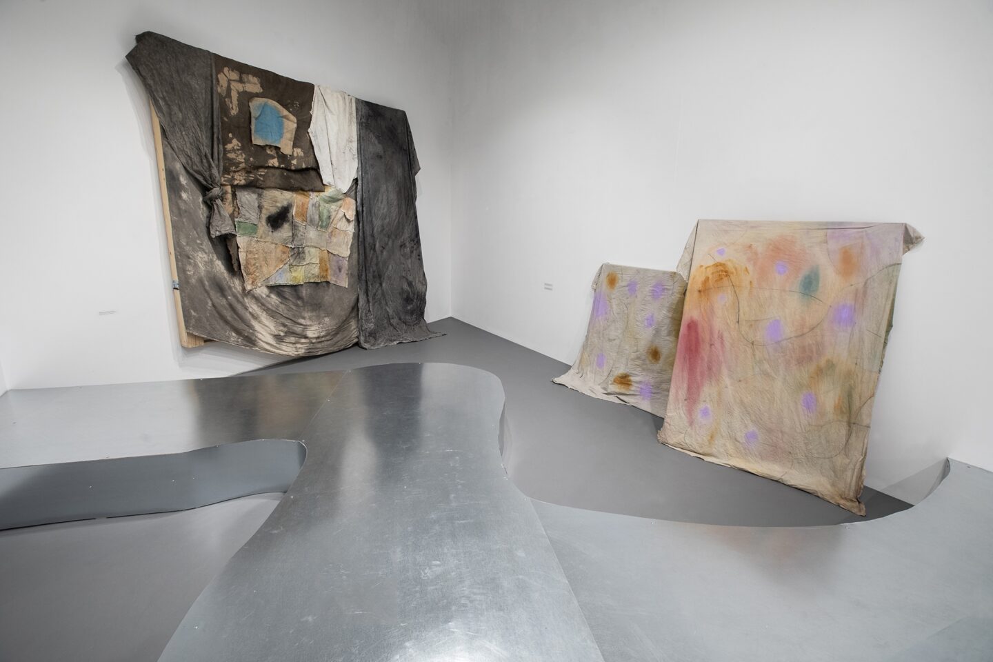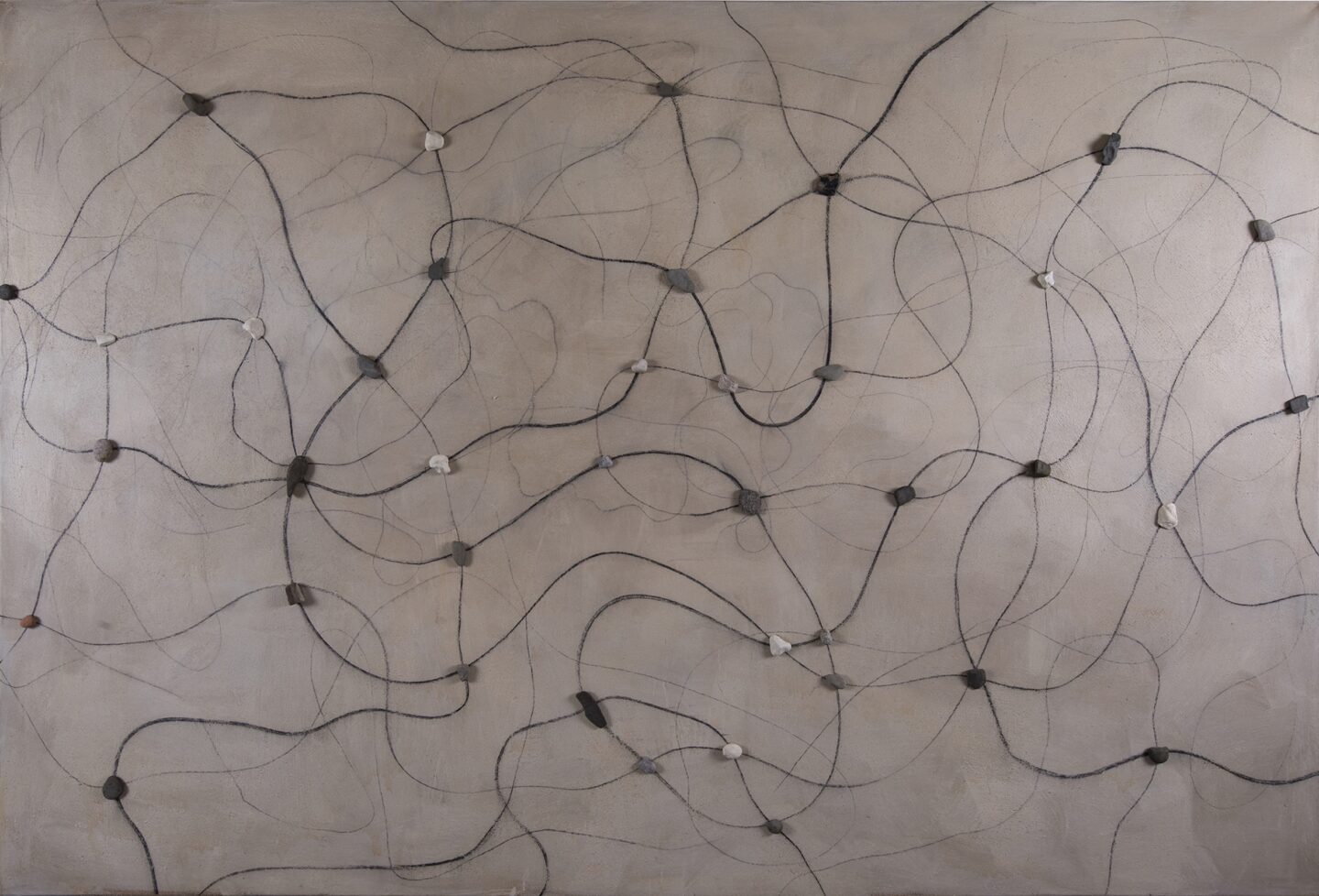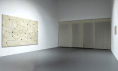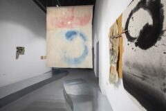 Są takie obrazy, o których nie sposób zapomnieć przez ich dosadność i natychmiastową, niemal brutalną, siłę oddziaływania. Są też takie, które zostają w naszym wewnętrznym imaginarium pomimo ich wizualnej nienachalności. Pomimo tego, że w pierwszym momencie więcej od nas wymagają, niż same chcą nam dać, nie dają się na raz objąć naszym aparatem poznawczym. Choć wydaje się, że przejście z pierwszego paradygmatu na drugi jest całkowitym zaprzeczeniem własnej dotychczasowej drogi twórczej, to w przypadku Ziółkowskiego jest jej rezultatem. Na wystawie motyw drogi subtelnie pojawia się w kolejnych salach. Od ołtarzowego procesyjnego charakteru ekspozycji pierwszej sali, poprzez stalową kładkę wymuszającą na nas określoną ścieżkę poruszania się, aż po ostatnią salę, gdzie wśród dwóch mniejszych (niezatytułowanych) płócien znajdują się dwa wielkoformatowe obrazy Ścieżka trwania (2025) i Ścieżka serca (2025). Drobne kamienie przytwierdzone do surowego bawełnianego płótna, trochę jak ślimaki o poranku zaraz po deszczowej nocy, stoją w bezruchu w gmatwaninie własnych śladów. Raz są jak drogowskazy ustawione na rozdrożach, raz coś porzuconego w wędrówce, by móc znaleźć drogę powrotną. A może to nie są ich ślady, a koleiny wytoczone przez innych, z których im samym nie sposób się już wydostać?